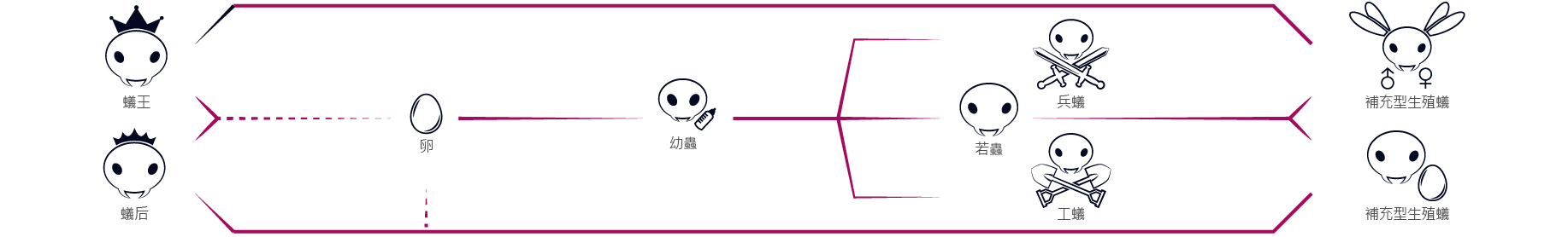 - 工蟻:築巢、餵食蟻后、兵蟻、照顧幼蟲。